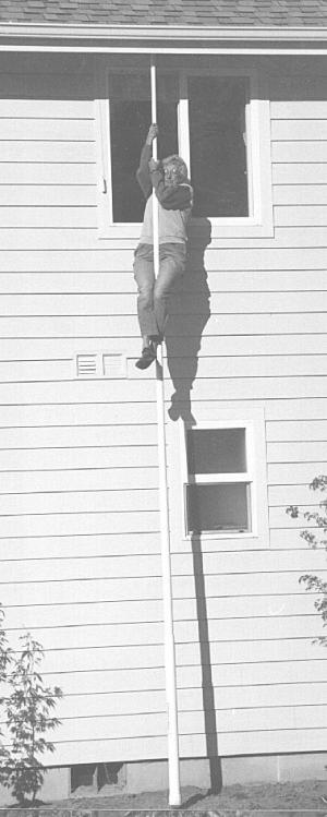 Made from powder-coated aluminum, the 17-ft. long telescoping pole collapses to 44 in. and is designed to be stored horizon-tally on a bracket under the roof outside a second story window. A trip cable attaches to the bracket. When you need to use the pole you open the window and pull on the cable, which trips the pole out of the bracket and allows it to swing down and telescope out to its full length. Then you climb onto the window sill, wrap your arms and legs around the pole, and slide down to the ground.