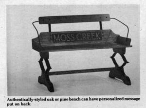Built with oak or pine, the bench is 42 in. long by 13 in. wide. Each part is hand-crafted and can be replaced if broken. It comes in two styles, either straight back or curved back, and is available in red, green, blue or black colors. It can also be purchased in natural wood colors, finished or unfinished. Benches are personalized with a sandblasted or silk-screened message on the back.