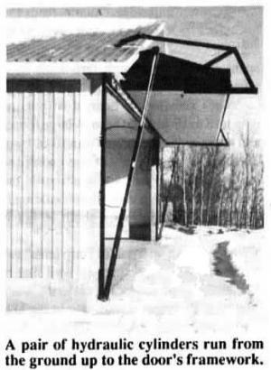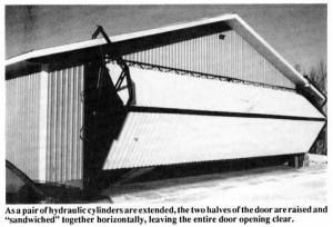 According to Dalman, the door can be built to almost any width. "One farmer wants me to build a 75 ft. wide, 16-ft. high door on his machine shed. There's no reason it can't be done. The door isn't affected by wind because the double-acting cylinders automatically lock it in any position when it stops. There's no need for manual locks."