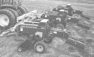 Here's a photo of the new splitter hitch they used this season to pull three Case-IH balers. It's built from 8 by 8-in. sq. tubing and is 16-ft. wide with 8-ft. long hydraulic arms to which the balers hitch. Balers are spaced 32 ft. apart from center to center when the arms are extended with the third baler positioned directly behind the tractor. This rig allows Larry and Kyle to bale three 16-ft. windrows at a time, producing 750 bales an hour. Distance between the balers can be adjusted with hydraulic arms to allow picking up closer windrows, too. For transport, the hitch raises up on the 3-pt. and the arms pull in so balers come to within 1 ft. of each other for an overall transport width of 24 ft. (Sherry Robinson, 8001 E. Farmers Ave., Amarillo, Texas 79118; ph 801 373-5891).