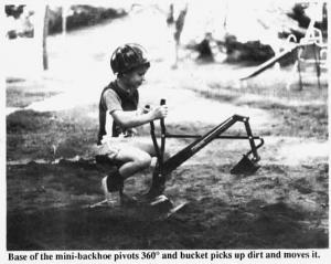 "It's built strong to last long," say manufacturers of this new mini-backhoe for kids. Everything on the rig is made out of heavy-gauge metal except for the handles and the seat. The base pivots 360? and the bucket really picks up dirt and moves it. Comes complete with a plastic hardhat.