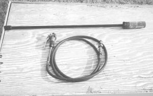 A 1/2-in. dia. steel pipe serves as the wand. A 4-ft. long acetylene hose off an old cutting torch hooks up to one end of the wand and feeds propane into it. The "flame thrower" at the other end of the wand is a 2-in. dia., 5-in. length of car exhaust tubing.