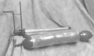 To use, thoroughly clean the womb and open the squeeze until the plastic extends from the roller to form a loop big enough to fit around the uterus. Thoroughly lubricate the inside of the plastic and the womb with liquid detergent or mineral oil and slip the uterus inside the plastic loop. Then, gently begin tightening the squeeze with the crank. Tighten until the uterus, which can be 1 ft. or more in dia., is about 8 in. in dia., depending on the size of the cow. Lock the squeeze and, with the aid of an assistant, slowly push the uterus out of the plastic and back inside the cow. Afterward, you'll have to pull the womb inside out, stitch the cow's vulva to ensure the womb stays in place, and give her an injection of penicillin.