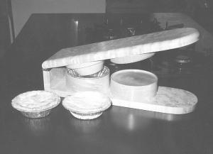 "The Tart Press is a hinged contraption crafted from solid maple. Between the top and bottom halves are a set of dies that hold either the foil or metal tart forms. To make shells, all you do is make your pastry in the usual way. Then drop a tablespoon of dough into the tin or pan and insert into the Tart Press. The tart shell will be instantly ready to be filled and baked. No need for a rolling pin or messy, flour-covered counters. The tart press will produce about 40 shells in 10 min.
