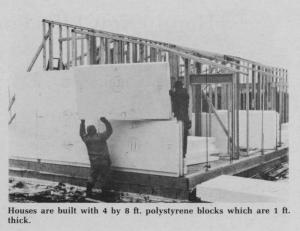 When building the houses, the foam walls are anchored with rods to a conventional foundation. Peterson notes that he's experimenting with using foam blocks as the foundation. Insul-Crete is then poured between the blocks to "cement" them together and is also spread in a thin layer on both sides of the walls.