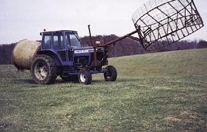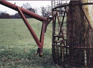 Thanks for the story on my "wired" round bale feeder that reduces waste (Vol. 22, No. 1). The story described how I use a 3-pt. boom to lift the rack up by the top ring and lower it over the bale without ever leaving the tractor seat. Here are some photos that show how the boom can be mounted on front of my Ford 7700 2-WD tractor, allowing me to haul the feeder and carry a bale on back at the same time. The boom is offset to the right side of the tractor so I can see the end of the boom alongside the tractor. (The hood is too high to see the boom if it was center mounted). Another photo shows how the boom hooks onto the side of the rack. (Robert Schum, HC 68, Box 221, Saint Meinrad, Ind. 47577 ph 812 357-5901)