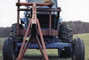 Boom Mounted On Fromt Of Ford 7700 2-WD Tractor TRACTORS Loaders 22-6-34 Thanks for the story on my "wired" round bale feeder that reduces waste (Vol. 22, No. 1). The story described how I use a 3-pt. boom to lift the rack up by the top ring and lower it over the bale without ever leaving the tractor seat. Here are some photos that show how the boom can be mounted on front of my Ford 7700 2-WD tractor, allowing me to haul the feeder and carry a bale on back at the same time. The boom is offset to the right side of the tractor so I can see the end of the boom alongside the tractor. (The hood is too high to see the boom if it was center mounted). Another photo shows how the boom hooks onto the side of the rack. (Robert Schum, HC 68, Box 221, Saint Meinrad, Ind. 47577 ph 812 357-5901)