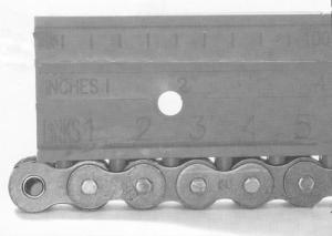 "Roller Chain Ruler"Takes The Guesswork Out Of Broken Chain Repairs FARM SHOP Repairs 23-1-39 If you've ever had to replace a broken chain roller, you know it can be a pain to get the chain sized right. This new "Roller Chain Ruler" has pegs on one side that hold the chain in place and large numbers on both sides of the ruler that tell you how many chain links you'll need. The ruler can also be read in millimeters and inches.