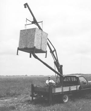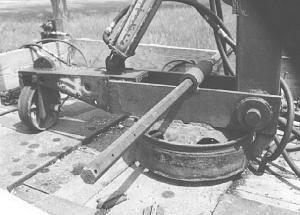 To allow the boom to pivot, Lashmett mounted the base of the boom on a truck hub. It is welded to the truck bed. An outrigger that provides extra support rolls on a steel plate in the truck bed. A horizontal bar that runs across the base of the boom is used to turn the boom from side to side. To hold it in place, Lashmett has a small braking fork which he inserts into the base.