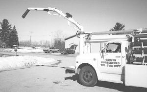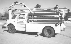 "There are three 20-ft. aluminum pipes carried on the right side of the truck and three 10-ft. long rubber hoses on the left side, for a total of 90 ft. of suction pipe that can be hooked up to the pump. There's also a screen and float on the end of the pipe in the water. We alternate the rubber and aluminum pipes to better follow the ground contour. After connecting the pipes together we use vacuum from the truck intake manifold to prime the pump. Then we fill the tank. Once we arrive at the fill site with the truck we put the emergency brake on and shift the transfer case. Then we shift into third gear and let the clutch out to operate the pump and fill the truck.