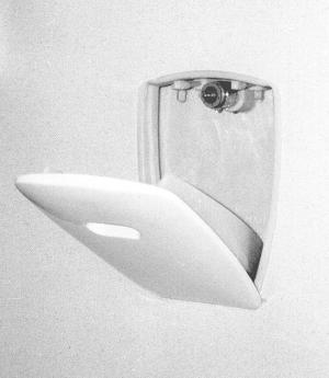 The porcelain unit mounts between 2 by 4-in. studs. A 1/2 by 3/8-in. pressure fitting screws into the top, and a trap is built in. It connects to a 1 1/2-in. dia. pipe.