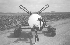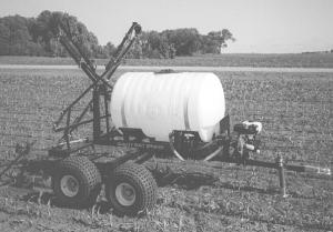 The "Quality Built Sprayer" mounts on four 25 x 12 x 9 flotation tires equipped with high speed hubs. The tires are adjustable on the axle to fit any row width (wheel spacing ranges from 54 to 90 in.). The tandem axle sprayer is equipped with a Honda 5 hp engine and either a centrifugal or roller pump and available with either a 110 or 150-gal. tank. Boom width is 28 or 30 ft., with nozzles spaced 20 in. apart. The boom comes with spring-loaded breakaway hinges and its height is adjustable from 18 to 36 in.