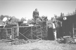 Row after row of sod blocks, one atop the other, were staggered like bricks for strength, grass side down. Cracks were filled with loose dirt. They set the door frame and windows into the sod walls as they went up. Log rafters support the wooden plank roof, which was first covered with rolled roofing material and then with a 4-in. layer of sod, grass side up.