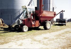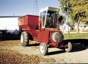 Vaessen bought a "junked" IH 815 combine for $500 and proceeded to strip it down to the frame, selling several hundred dollars worth of parts off the machine in the process. He reversed the drive on the machine, mounting the cab and the original V-8 engine on the rear end and installing a custom-built grain cart over the drive wheels. He built the 400 bu. grain box himself out of 22 ga. sheet metal, modeling it after a commercial-built cart. He took the metal to a local mill to bend it.