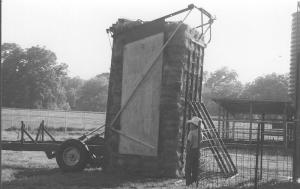Portable Small Square Bale "Stacker" BALE HANDLING Bale Handling (31B) 24-1-27 "I use a New Holland Stackliner to pick up and bring small square bales in from the field and temporarily stack them on the ground. Then I pick them up with a hay grabber on front of my tractor and stack them in my barn. Normally the bales on the first stack have to be ęstair stepped' in order to keep them from falling over. My home-built bale stacker provides a back stop to unload the first stack against so I don't worry about it falling over," says Bob Sallee, Coffeyville, Kan.
