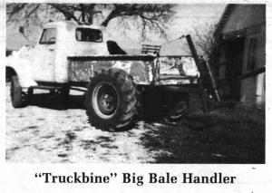 Truckbine big bale handler BALE HANDLING Bale Handling (31B) 10-1-10 "I wanted something that would get through snow and over rough terrain. I don't own a tractor with a cab," says J.C. Long, Warrensburg, Mo., who fitted an old 1¢-ton Chevrolet truck with big 14 by 26 combine tires and a bale spear. "It'll go anywhere my 450 IH tractor will go. It's great to ride in a heated cab when feeding cattle on a winter day.