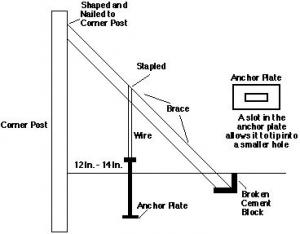 He installs a single corner post with a brace leaning against one side. To secure the base of the brace, he sets it into a broken "L-shaped" piece of a concrete block. The anchor consists of a steel rod that goes down through a steel plate with a hole at the center. The plate is loose so it can be turned sideways to get it down to the bottom of the hole. Then it's laid flat and covered over. Heavy wire runs from the top of the anchor up to the brace and is tied tightly. The anchor is set 12 to 14 in. from the post.