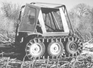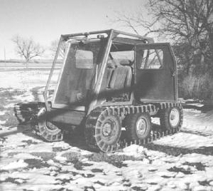 It rides on 11-in. wide, 8-ft. long rubber tracks made by cutting the tread out of a pair of 46-in. rear tractor tires. The tracks are friction-driven and ride on three sets of axles equipped with 16-in. pickup wheels. Power is supplied by an Isuzu 4-cyl. diesel engine and a manual 4-speed transmission, both of which mount on back. The transmission shaft-drives a Chevy rear end (off a 1978 3/4-ton pickup). The rear end is mounted upside down on the front of the machine. There are eight forward gears and two reverse. A 2-speed transfer case provides low-speed gears. Top speed is about 30 mph.