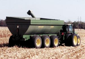The 1,250-bu. model actually has a capacity of 1,000 bu. but adding an extension on one side boosts the capacity by 250 bu. It's equipped with tandem axles and floatation tires. The cart's 16-in. dia. unloading auger empties 1,000 bu. of dry corn in only about 2 1/2 minutes. A 12-in. recessed floor auger keeps the unloading auger full during unloading.
