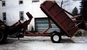 "The tailgate on back of the trailer is fitted with a loading ramp that I use to load smaller chunks of wood into the trailer. It tilts back hydraulically to dump into the trailer box."