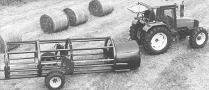 Hydraulic lifts on the wheels lower the bale hauler to ground to pick up bales. The hydraulic-controlled tongue swings unit out from behind the tractor. "You can load bales at either end of the tunnel," says Malone. "If a bale is dropped off near a fence where you can't get to it by driving forward, you can pick it up by backing the transporter over it."