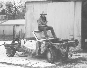 "It was a hot summer so we made it into a convertible and started using it for doing fence work and driving around the farm. It went over a lot of tree stumps, and one day the back end of the pickup flew off when we hit a tree. The original lights got knocked out by tree branches, and the front bumper was damaged when it hit a steel post. With no hood to support them, the doors started sagging so we used baling wire to shut them permanently. We used the hood for a sled, pulling it behind the pickup.
