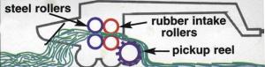 The Macerator 6600 has a 66-in. wide pickup. Behind the pickup is a pair of rubber intake rollers, followed by a pair of steel rollers. The distance between each set of rollers is controlled by air bags. The machine is equipped with an air tank and three control gauges. One shows tank pressure, and the other two monitor pressure on the two sets of rollers.