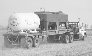 To feed the various components of the one-pass system, Allard rigged up a large-scale nurse unit, using a 35 by 8-ft. trailer they already had. The trailer carries a 2 and 4-ton tank and a 2,000-gal. anhydrous tank. It takes about 25 minutes to fill the one-pass system, which can seed 60 acres of oats or 120 acres of canola without stopping.