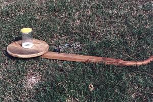I made a garden planter for tiny seeds out of plastic peanut butter jar and a wooden wheel. The jar is screwed to the center of the 1-in. wide, 12-in. dia. wheel which bolts to a 36-in. long handle. As the wheel and jar turn, seed falls out of a series of 1/8-in. dia. holes that I drilled into the base of the jar. The holes are spaced 1 inch apart. A length of chain is used to drag soil over the seed. When I fill the jar I place a piece of tape over the holes to keep seed from falling out before I'm ready to plant.