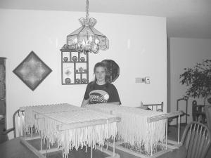 Since pasta must be dried on a rack for at least 24 hours before bagging, they asked another friend to make them four large racks from white oak. They hold 15 lbs. each.