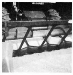David Sauder, of LeRoy, built the "tire header" for his 1983 Gleaner F2 6-row combine. A series of 12 horizontally-mounted lawn mower wheels are used in place of the reel to gather plants in. The 16-in. tires are mounted horizontally just above the sicklebar. They're supported by a steel frame that mounts on the reel arms. The orbit motor and hydraulic system that normally drives the reel is used to rotate the center tire which in turn drives all of the other tires, with each pair of tires turning inward.