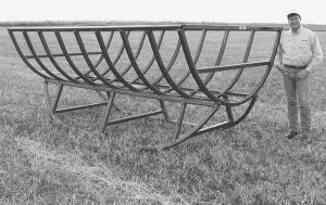 A patented new bale feeder from Common Sense Mfg. is made out of 2-in. sq. tubing and is designed with a curved bale saddle that holds two bales. It mounts on a pair of curved skids and can be moved by a front-end loader. The curved bale saddle design allows calves to get under the bale far enough to get to the center of the bale. It also keeps calves from climbing into the feeder and getting stuck or hurt.