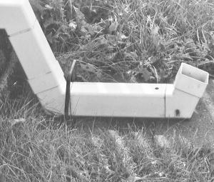 "Soon after I seeded the lawn, we had a couple of rains, and the force of the water coming out of the horizontal downspouts washed away much of the soil below. As a result, most of the grass seed ended up at the bottom of the hill. I had beautiful grass down at the bottom of the slope, but bare ground on top," says Troendle. "Putting in sod on such a big area would have been too expensive. So instead I decided to replace the horizontal downspouts with my own design."