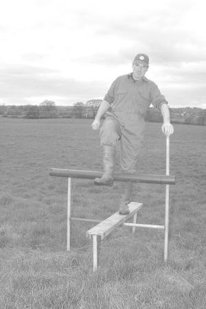 The triangular base has three metal spikes that stick into the ground. A horizontal plastic tube encloses the electric wire to keep walkers from getting a shock. The walker steps up on a lightweight platform and grabs a handle to help himself over the tube.