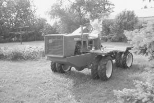 The drive axles are from two 1-ton Chevrolet trucks with vacuum 2-speed rear ends. The engine is a Chevy 6-cylinder 292. He used an automatic transmission and transfer case from a 3/4-ton Chevy 4-WD pickup. The steering console, grill and radiator were salvaged from a 190-XT Allis. He put the two truck axles together so they pivot in the center and used a hydraulic cylinder mounted on one side of the frame to steer. A hydraulic pump mounted on the motor provides power for the steering.