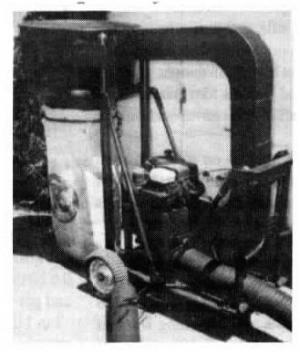 His leaf picker-upper is powered by a 3.5 hp. gas motor that drives a horizontally-mounted 10-in. dia. fan rotor with four 4-in. wide blades. It sucks leaves up through a length of 4-in. plastic hose and blows them up through 4 by 5-in. metal ductwork to an overhead bin made out of a portion of a 50-gal. oil drum. A 5-gal. metal bucket attached to the bottom of the bin forms a neck around which a burlap bag fastens with a screen-door type spring. The framework is made of scrap angle iron, steel fenceposts, and other scrap metal.