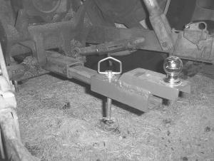 With the hitch in storage position, the ball hitch is out of the way and the tractor's drawbar hole is completely accessible.