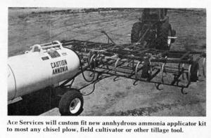 Special ammonia knives are available to replace the regular sweeps or chisels. Spring tooth and other finishing-type implements can be converted by the addition of special shanks to place the ammonia at sufficient depth for good sealing. Subsoilers and sweep-type shovels, which also lend themselves to conversions with special applicator tubes, are also available from Ace.