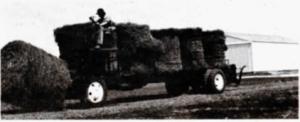 A hydraulic motor, belt-driven off the engine, powers the steering and bale-moving chain on the bed. A "control tower" built off to the side of the front left corner contains full controls. To load, Miles slips the fork under a bale, raises it to bed level and moves it back the width of one bale with the chain conveyor, leaving room for the next one up. The procedure is reversed to unload.
