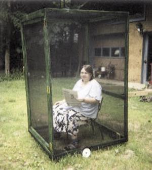 "You could make it any size you want and it's easy to move because it's so light. I used pine for the frame with steel brackets at the corners to hold it rigid. It's covered with fiberglass screen with the edges dragging on the ground to seal it. There's no floor." Plastic wheels and two handles make it portable.