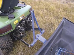 Ehrman's garden tractor had a 3-pt. hitch so his auger mover hooks on quickly to move his 8-in. by 45-ft. auger, complete with grain hopper, without having to clean everything out.