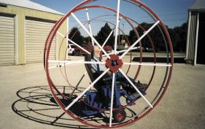 The "gravity car" steers like a skid steer loader and can spin in circles. The 8-ft. dia. steel wheels are connected together by a U-shaped "hub" made from 2 by 4 rectangular tubing. The operator sits in a pod that swings back and forth like a pendulum on the U-shaped hub.