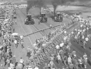 Bill Jansen, Dieterich, Ill., realized a whimsical ambition of his last August at Rantoul, Ill., when he put together three old-time Case 110 steam engines and had them pull a world record 60-bottom plow. The previous record had been a 50-bottom hitch.