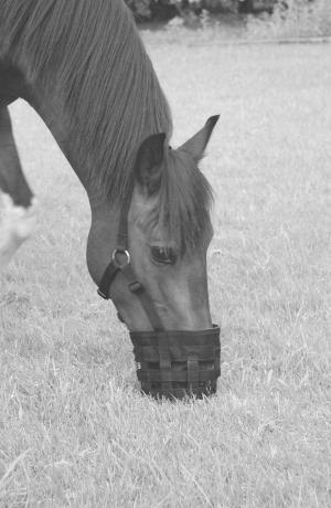 The safe and comfortable muzzle has a small opening in the bottom that allows horses to eat a limited amount of grass, but drink unlimited water. In this way, they can remain in the herd, exercising and socializing in the pasture.