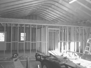 Rose says the hardest part of putting up the building was lifting each of the twenty 2 by 30 ft. overlapping metal spans. "They're like wet noodles. When you start up with them, they go this way, that way, and every which way," he says. To handle them, Rose used his little Bolens 17 hp 4-WD diesel tractor and put a 4 by 4 on the front of the grill guard with a battery-powered winch on the back of it. A cable runs through a pulley at the top that hooks to the span and lifts it up. He built A-frames out of 2 by 4's and put a come-along on each corner to get each corner to come up at the same time. "Then, I had to continually climb on the tractor, off the tractor, and on the tractor again. That's the part that took most of the 10 days to do," he says.