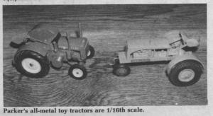 Parker-built, all-metal toy tractors are 1/16 scale. They're sand cast aluminum with machined and formed steel parts. Prices range from $225 for a 1937 John Deere A; $165 for a 1955 Farmall Super M; $150 for a 1938 Allis-Chalmers WC, 1956 Case 400 and a 1938 John Deere D; and $100 for a 1959 replica of a Minneapolis Moline UBE.