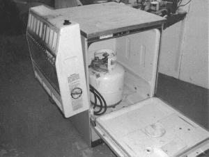 He Bolted Propane Tank Mounted Inside Dishwater On Wheels FARM SHOP Miscellaneous 30-3-36 Gary Gahagen, Wiggins, Colo.: "I bolted a 20,000 btu. wall heater to the side of a dishwasher on caster wheels. I put an 8-lb. propane tank inside with a flexible gas line to the heater. The door locks and seals the tank inside. It can be easily moved anywhere in the shop I need heat. The top also works as a portable stand for my drill press, wood planer, etc."