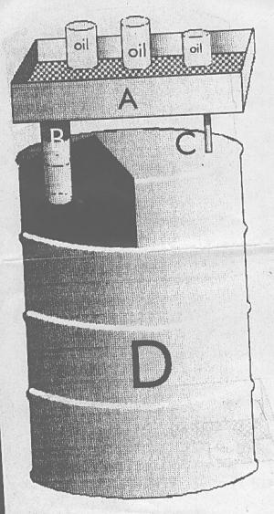 Herman Vandehey, 39595 N.W. Wilkesboro Rd., Banks, Ore. 97106 (ph 503 324-7573): "We developed this æair guard' oil drain pan and are now selling it for $99.95 post paid. The drain pan is 4 in. deep with a 2-in. expanded steel platform above the base of the pan. The oil drains down into the pan and down the drain pipe. The pipe extends far enough into the drum so when oil reaches the bottom of the pipe it creates an air tight seal, no longer allowing oil to drain into the drum so you can take the pan off before the barrel overflows. A small support rod on the opposite side from the drain helps stabilize the pan."