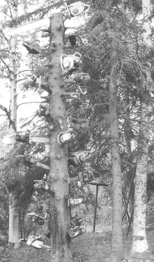 "Alaska Chainsaw Tree" AG WORLD 30-5-21 Before retiring a few years ago, Roy Baldwin had used chainsaws or worked on them for more than 30 years. "After all that time working on the darn things, I figured I had to find a good way to get rid of all the ones that no longer worked," he says.