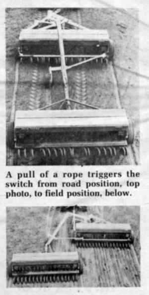 By pulling a rope, the tractor operator switches non-stop from road to field position, or vice versa. In road position, width of the hitch is no wider than the drill, permitting travel down any narrow country road, without overhang, the manufacturer points out. The hitch's zero turning radius allows you to plant back and forth.